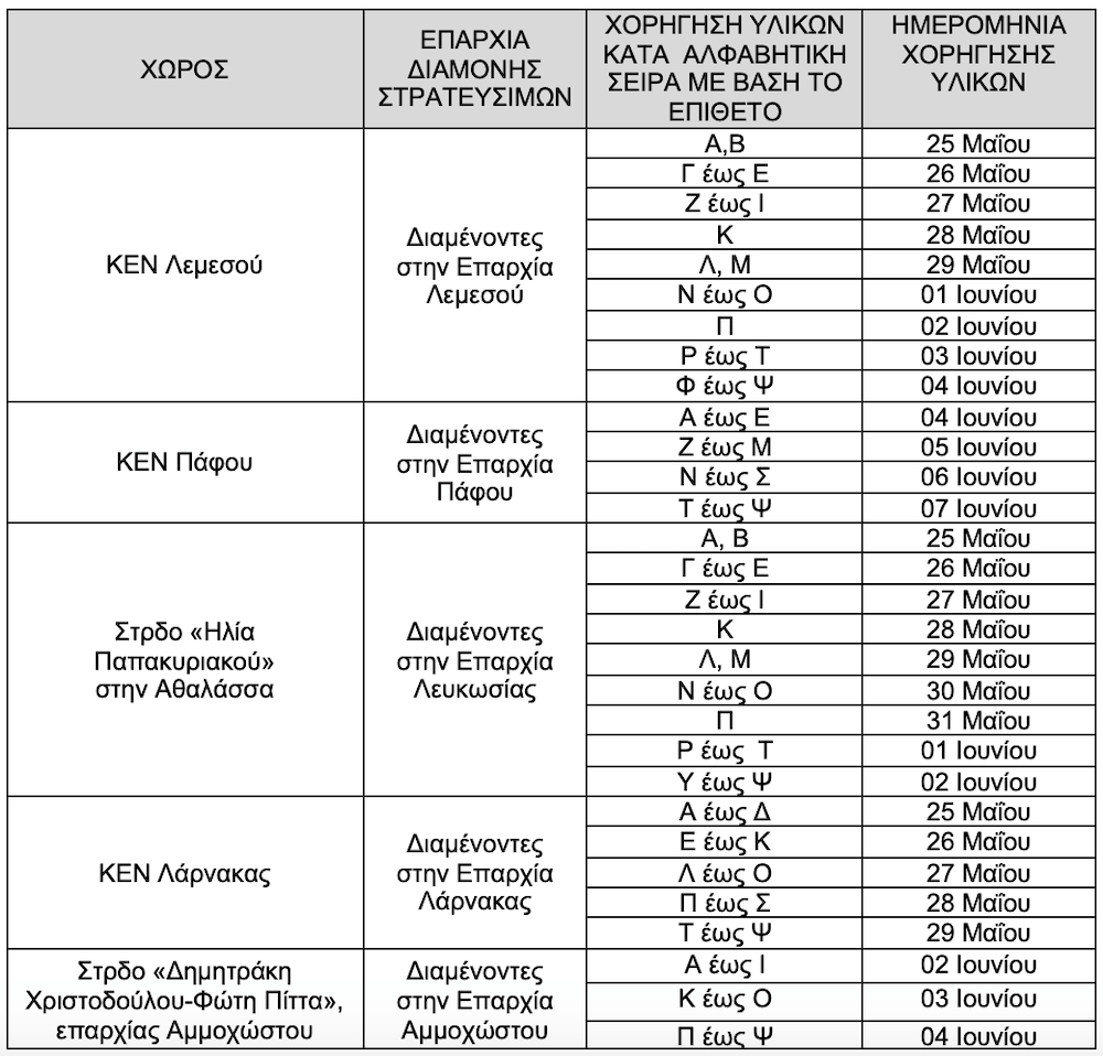 Οι στρατεύσιμοι καλούνται να προσέλθουν, έχοντας μαζί τους την πολιτική ταυτότητα, στα κέντρα χορήγησης υλικών την ημέρα που αντιστοιχεί στο πρώτο γράμμα του επιθέτου τους, όπως παρουσιάζεται αναλυτικά στον πιο κάτω πίνακα. Τα υλικά θα χορηγούνται από τις 08:00 έως τις 19:00.